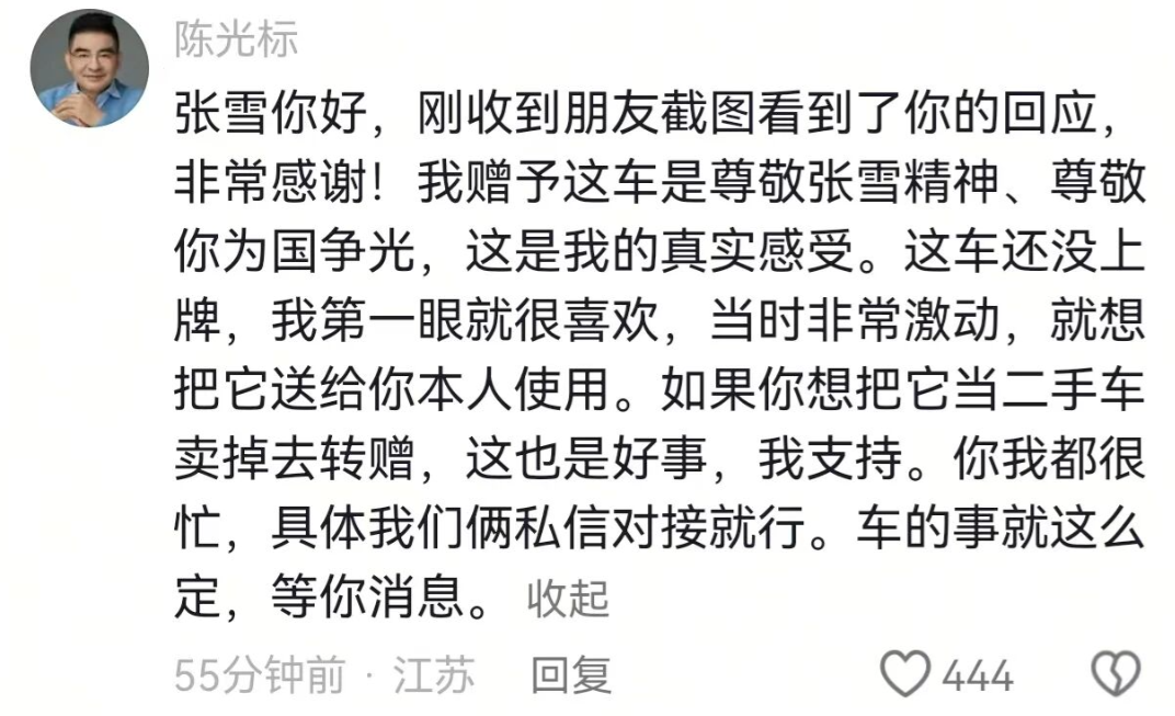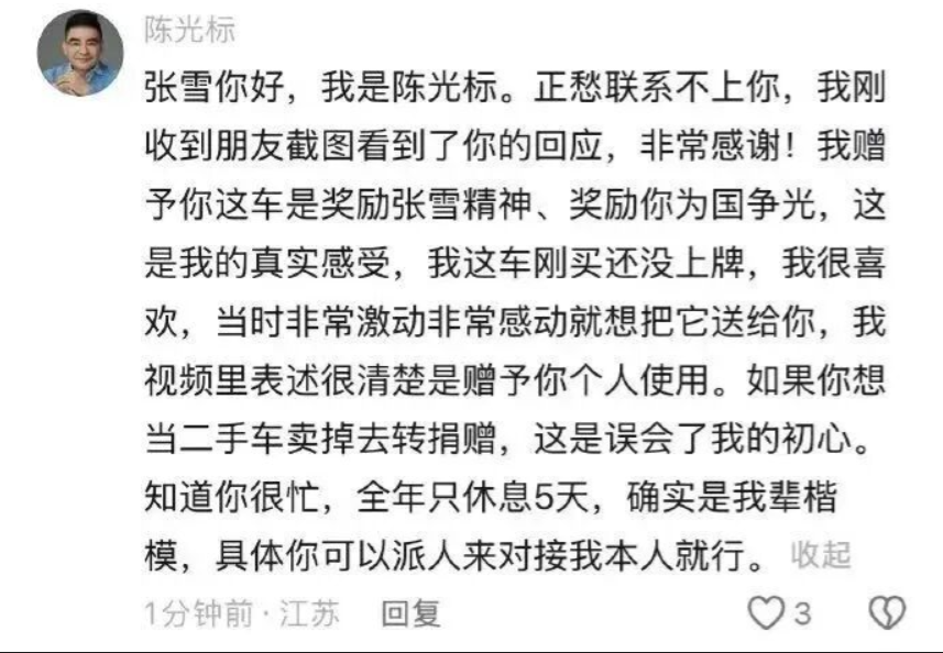 张雪你好,刚收到朋友截图看到了你的回应,非常感谢!我赠予这车是尊敬张雪精神、尊敬你为国争光,这是我的真实感受。这车还没上牌,我第一眼就很喜欢,当时非常激动,就想把它送给你本人使用。如果你想把它当二手车卖掉去转赠,这也是好事,我支持。你我都很忙,具体我们俩私信对接就行。车的事就这么定,等你消息。(钱江晚报)