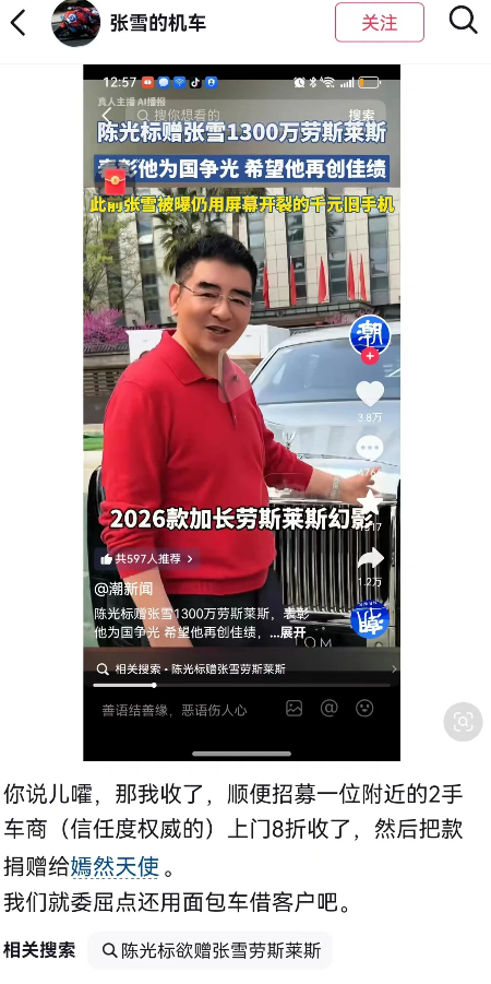 4月1日,慈善家陈光标称要“将1300万劳斯莱斯赠予张雪机车创始人”,他透露这台“中国唯一的2026新款加长劳斯莱斯幻影”已运抵南京,希望通过媒体联系上张雪完成交付。